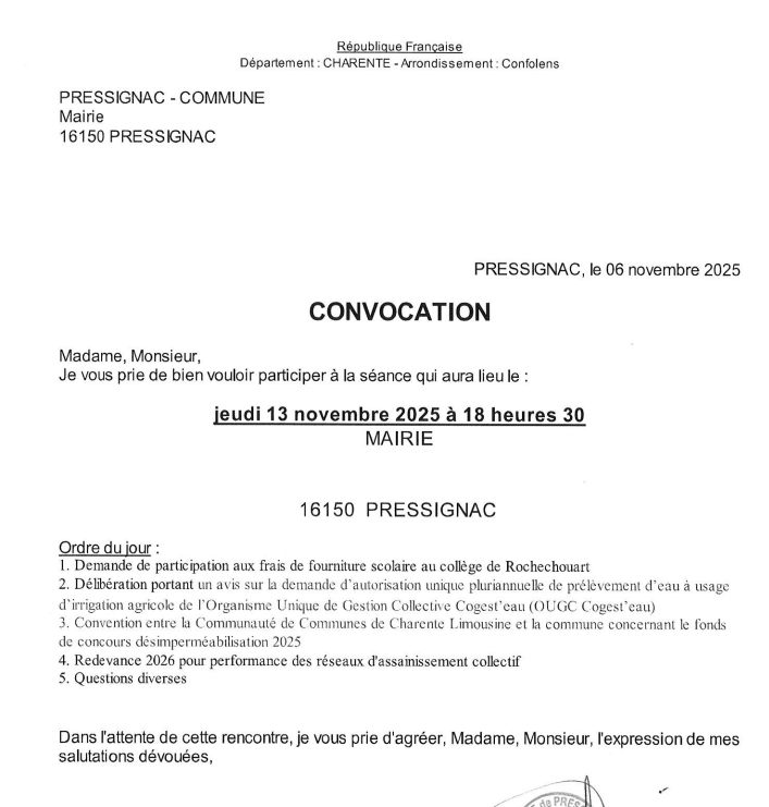 CONSEIL MUNICIPAL Jeudi 13 NovembrePublié par secretariat le 6 novembre 2025 Catégories : Vie Municipale