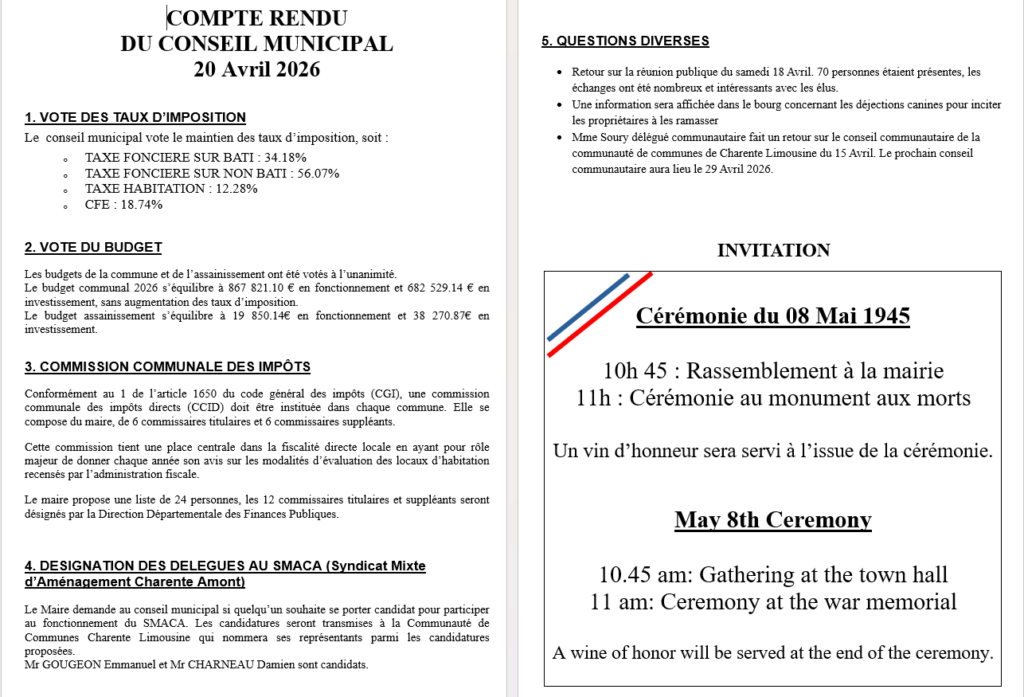 COMPTE RENDU DU CONSEIL MUNICIPAL 20 AVRIL 2026